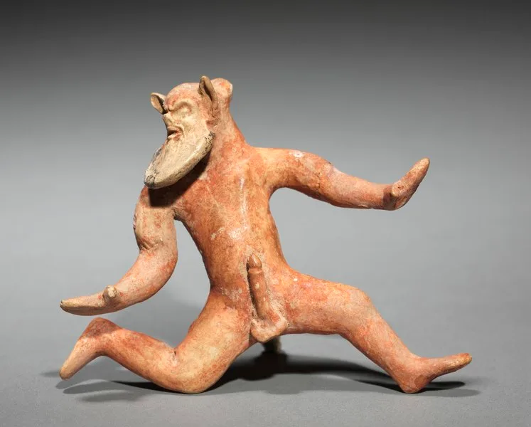 Frontal view of a red-hued statuette of a part-beast, part-human figure with an erect penis